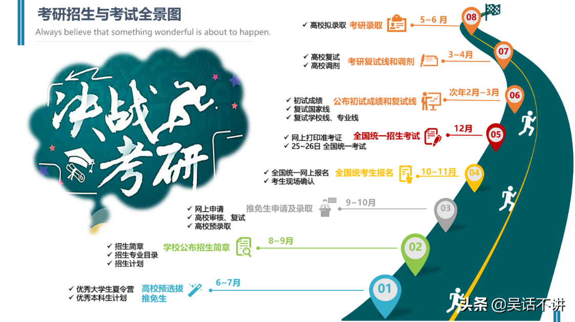 一旦你决定了参加考研,那么你最好提前预览一遍考研的全景,记住有哪些官方规定的日程安排,提前做好对应的准备工作。考研是打一场有具体作战计划的战役,要避免在关键战斗上错失战机或仓促应战。