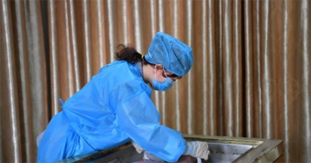许伊妃在开始工作前,会先穿上工作服,戴上帽子口罩和手套,然后来到逝者的遗体面前,深深地鞠一躬。