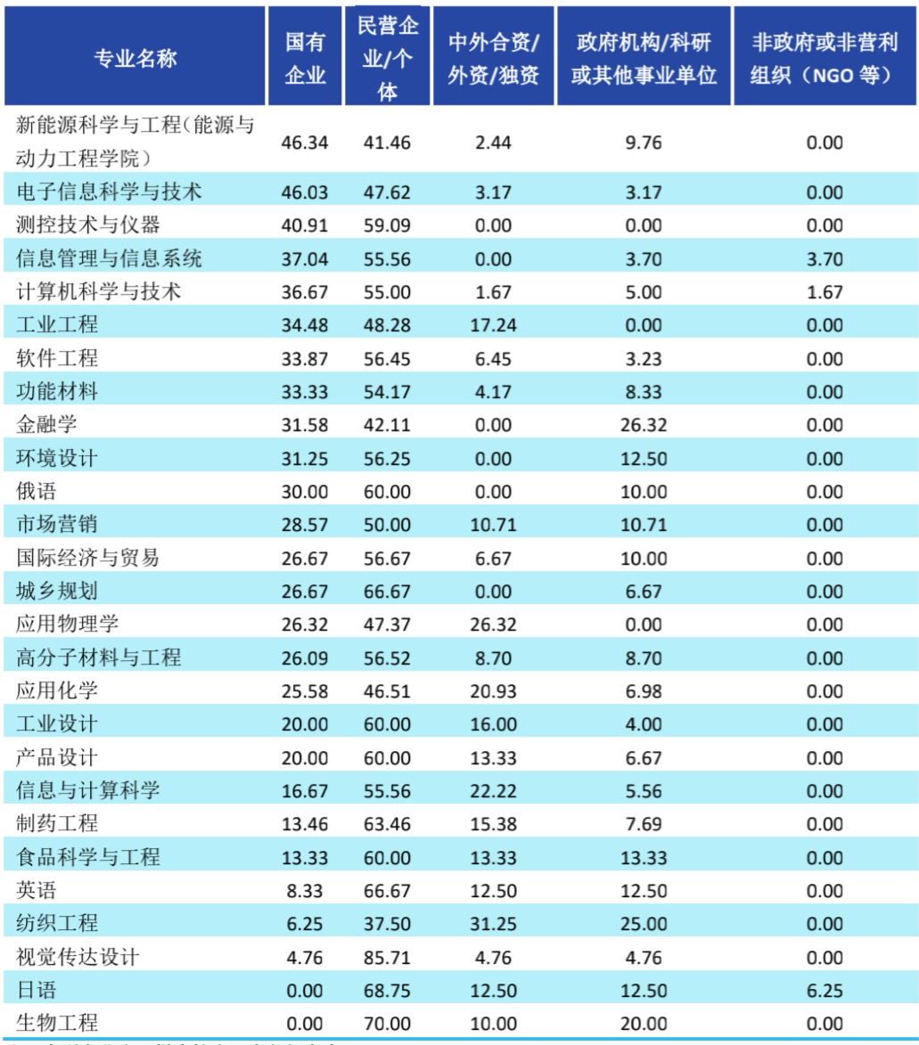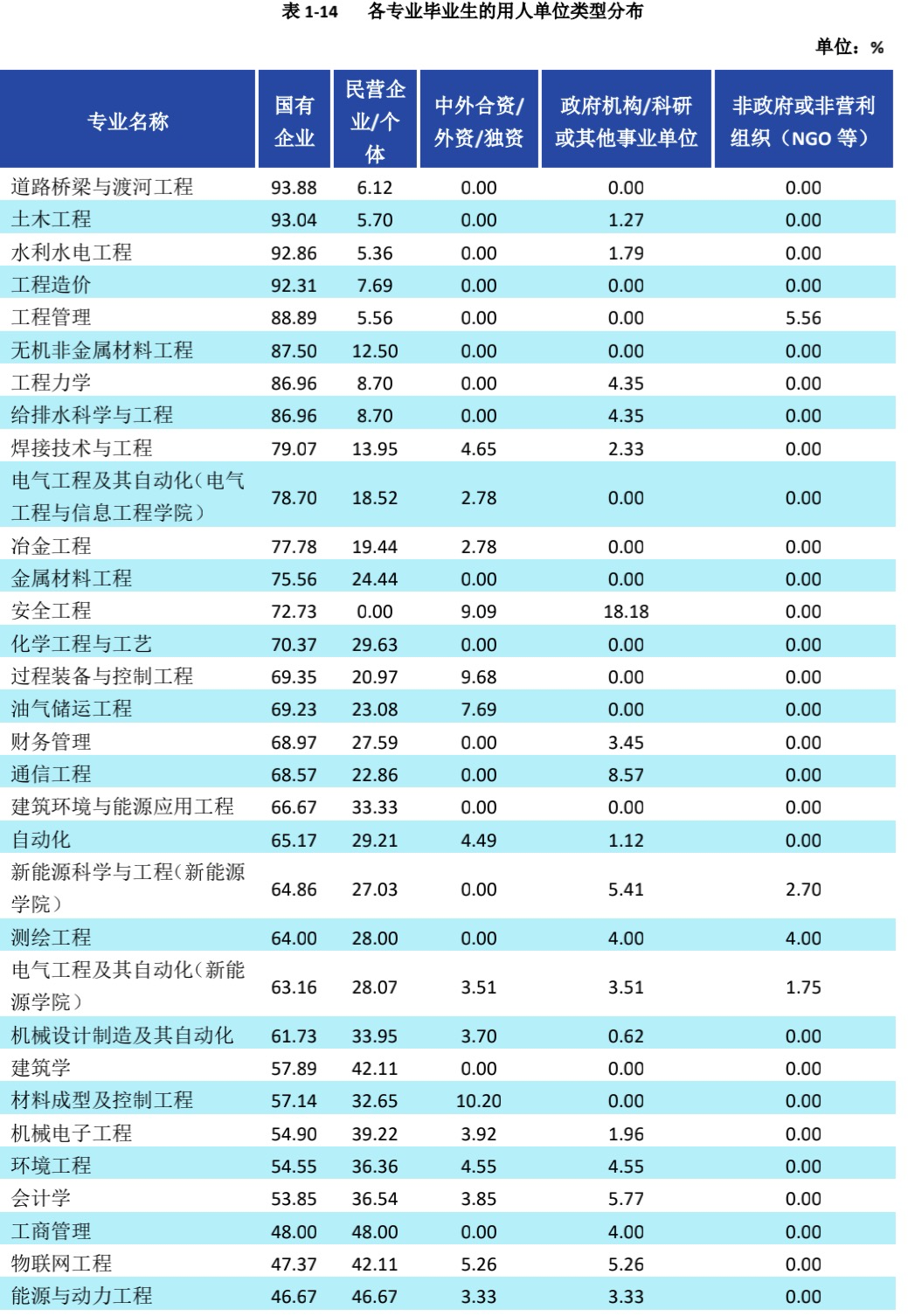 从上面两张图可以看出,道路桥梁与渡河工程、土木工程、水利水电工程、工程造价、工程管理、无机非金属材料工程、工程力学、给排水科学与工程、焊接技术与工程、电气工程及其自动化、冶金工程、金属材料工程、安全工程、化学工程与工艺、过程装备与控制工程、油气储运工程、财务管理、通信工程、建筑环境与能源应用工程、自动化、新能源科学与工程、测绘工程、机械设计制造及自动化等20多个专业,到国有企业工作比率都在60%以上,可以作为大家重点考虑的对象。