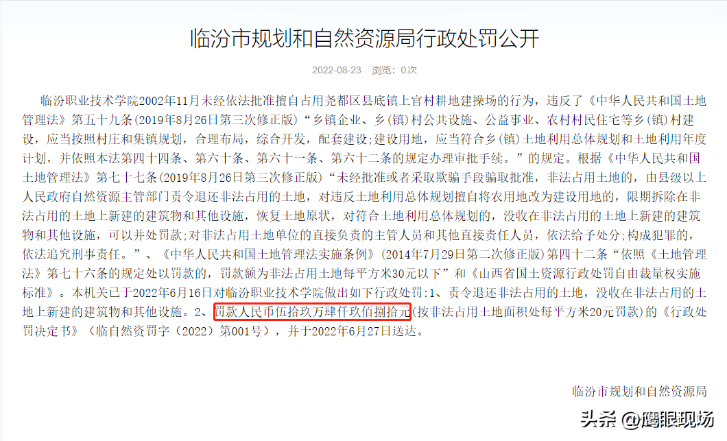 本机关已于2022年6月16日对临汾职业技术学院做出如下行政处罚:
