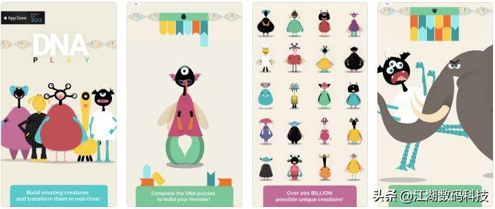 让孩子亲手创建各种各样的怪物,并且可以通过改变DNA片段来改变怪物的样子,从而直观地感受基因的力量。其他类似的游戏包括 Sago Mini Monsters - 没有DNA的概念,主要靠手画,以及Miximal,动物身体的组合。
