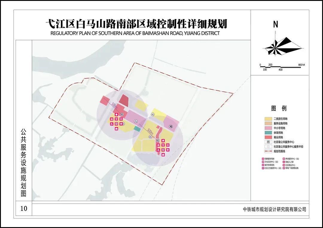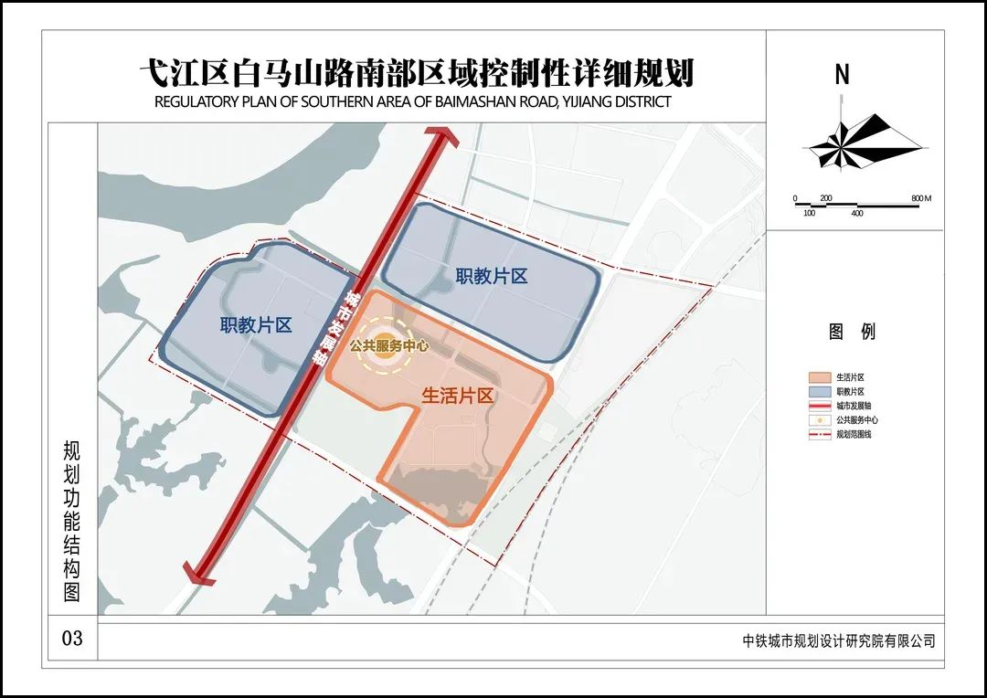 “一心”以片区商业商务中心为依托构建的公共服务配套体系;“一轴”即长江南路的城市发展轴;“三片区”即东南部的宜居生活片区,东北部和西部的职教产业片区。3
