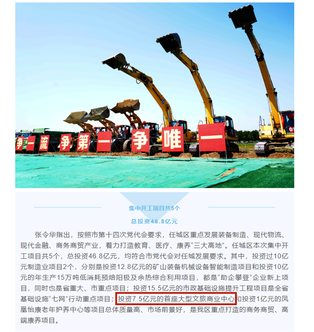 在任城区分会场,集中开工项目共5个,总投资46.8亿元,其中济宁城投与全国地产百强企业星盛商业合作的济宁首座大型文旅商业中心得到了较大的关注。