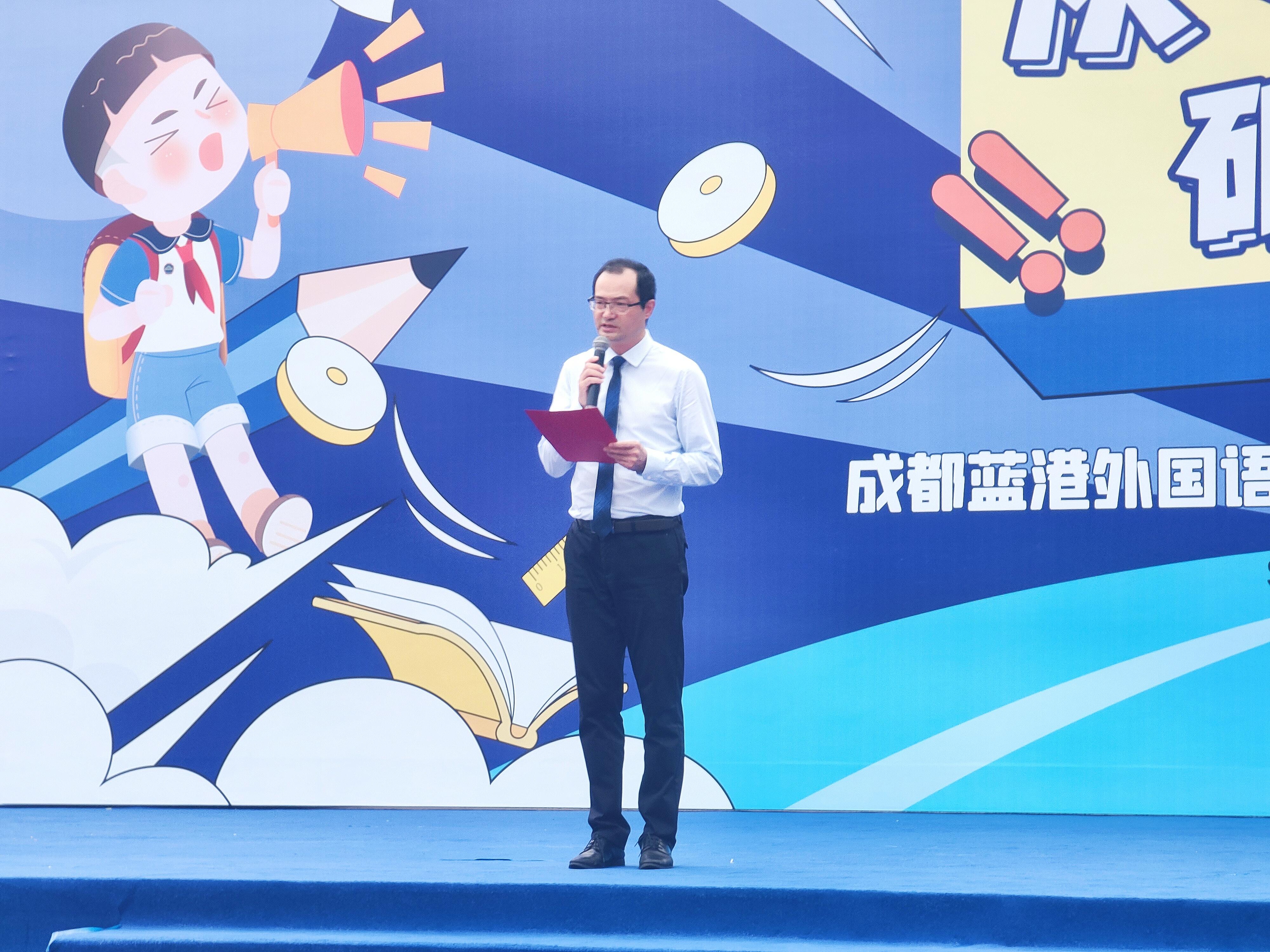 庄严的升旗仪式后,李海华上台发表新学期致辞。他表示,在过去的一年中,全校师生齐努力、共奋进,在教学质量和队伍建设方面都取得了一定成绩。今天是蓝港的新起点,相信同学们会在蓝港健康快乐地成长。