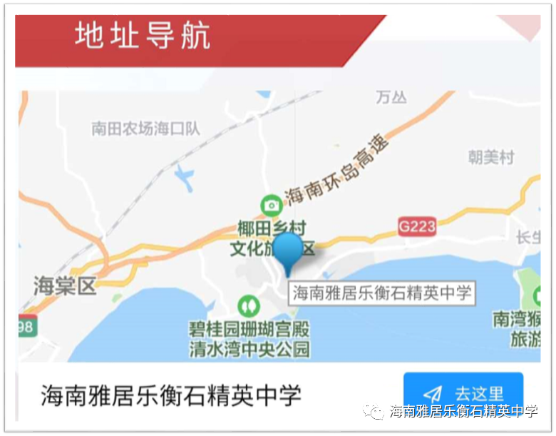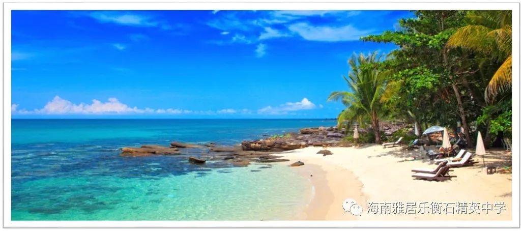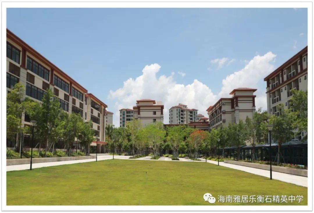 海南雅居乐衡石精英中学,占地170亩,地处北纬18度线以南,位于海岛南端最美清水湾,距离著名国际旅游城市三亚不到10公里,背靠群山,面朝大海,近邻世界顶级天然海滨浴场。空气清新,阳光明媚,椰风海浪,景色旖旎,校园绿树如茵,建筑时尚气派,环境十分优美。