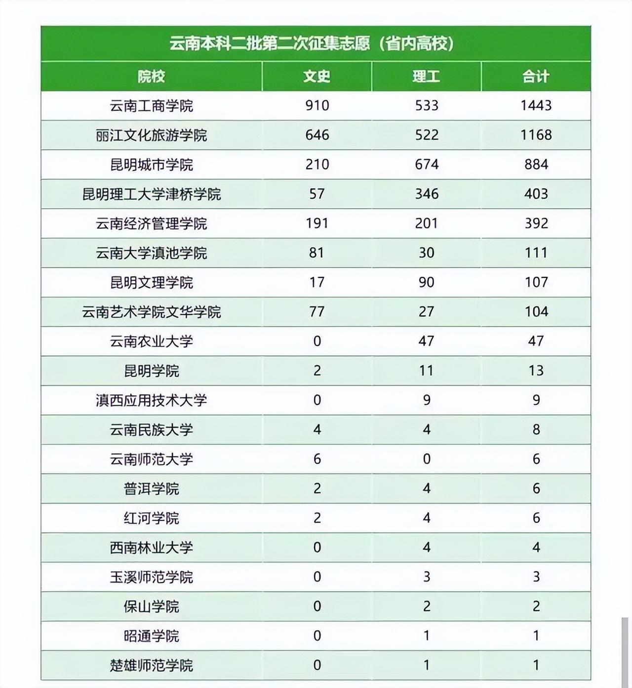 云南二本批次进行第二次学生征集志愿,云南民族大学、云南师范大学还有一些少量的缺额。
