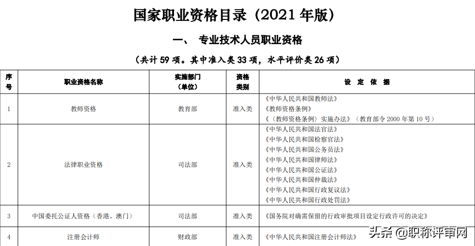 专业技术人员职业资格又可以分为准入类和水平评价类,其中准入类占了33项,水平类占了26项
