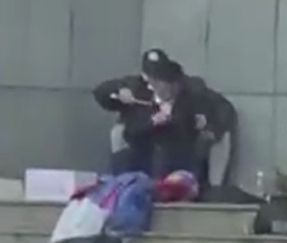 距持刀男子不到10米处,一名受伤学生躺在地上,有4名疑似老师的人员帮其包扎处理伤口。