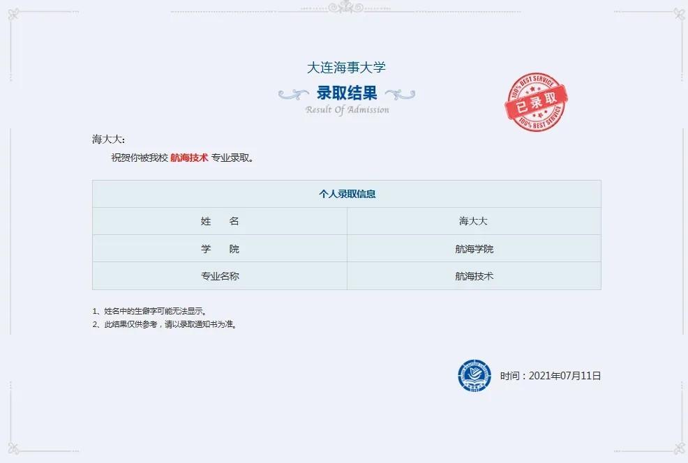 大连海事大学2021年本科招生录取工作正在有条不紊进行,录取结果将陆续公布,欢迎广大考生家长关注大连海事大学本科招生网及大连海事大学本科招生办官方微信公众号查阅录取结果。