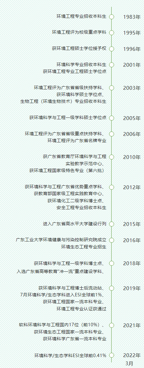 广东工业大学环境科学与工程学院在广东省最早(1983年)招收环境工程专业本科生;现有环境科学与工程一级学科博士点、博士后科研流动站,环境科学与工程学术型硕士点、资源与环境(环境工程方向)专业型硕士点,环境工程、环境科学、安全工程三个本科专业。环境科学与工程为广东省优势重点学科,2018年入选广东省高等教育“冲一流”提升计划重点建设学科,2021年为学校“1+2+3攀撑计划”重点建设学科。2022年3月工程学ESI全球前0.092%、环境科学/生态ESI全球前0.41%,2021软科中国环境科学与工程学科排名17位(前10%)。环境工程为国家级特色、国家一流本科及广东省名牌专业,环境科学为广东省一流本科专业。