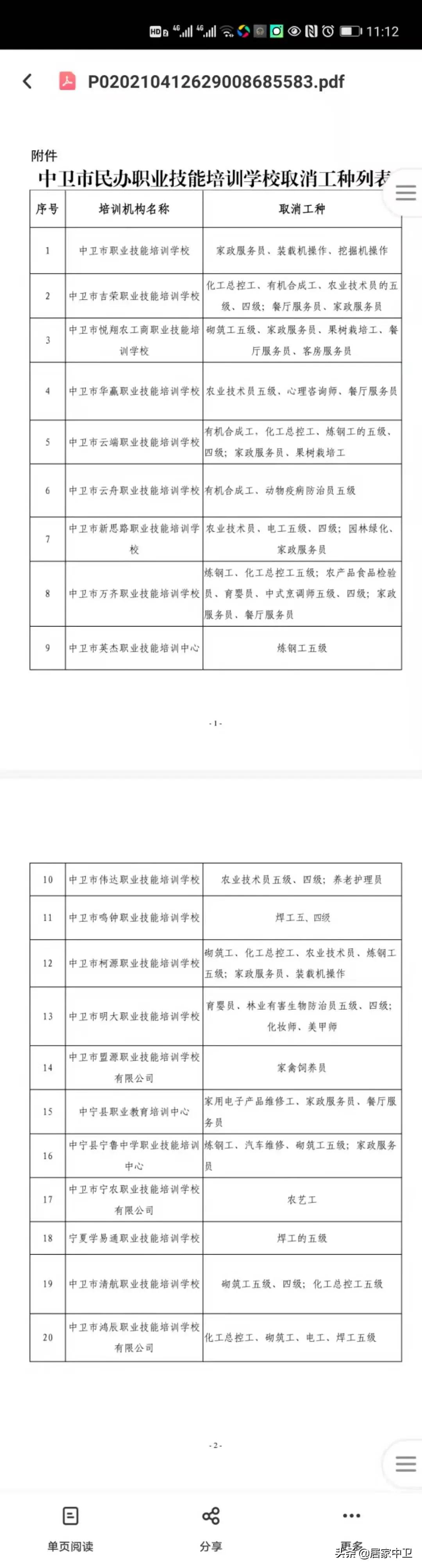 中卫市职业技能培训学校等20家民办职业技能培训学校: