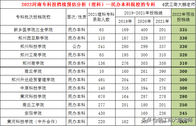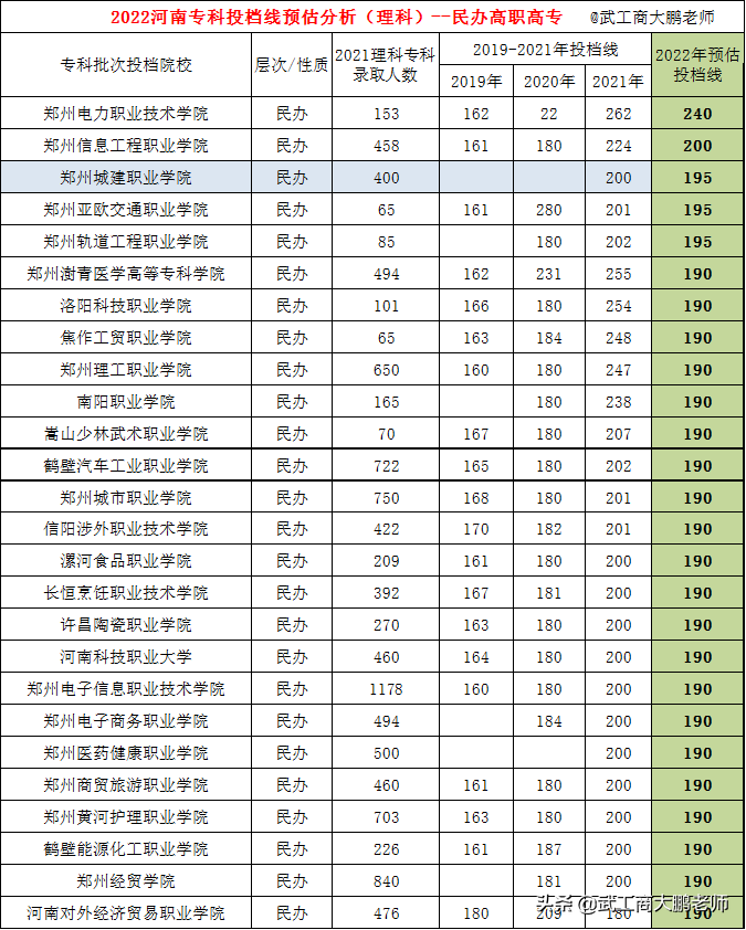 2022河南专科投档线预估分析(理科)--民办高职高专除了郑州的之外,大部分190分压线能上。