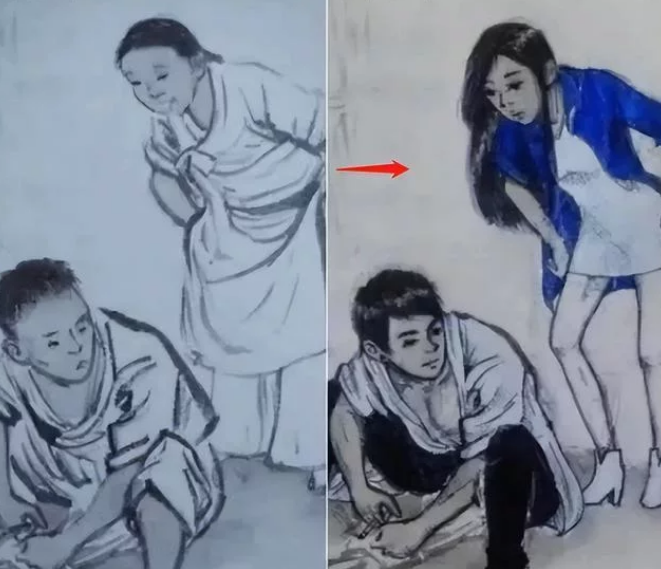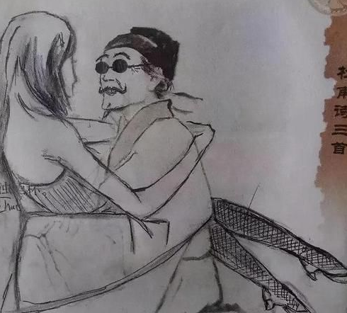 首先给杜甫画上一个墨镜,看上去像是个算命先生,嘴角微微上扬45度,是因为怀里还抱着个长发及腰的美女,而网友们也是看到重点,这位美女还穿着一个吊带和一双丝袜,脚上配着一双高跟鞋,可以说是非常现代了。