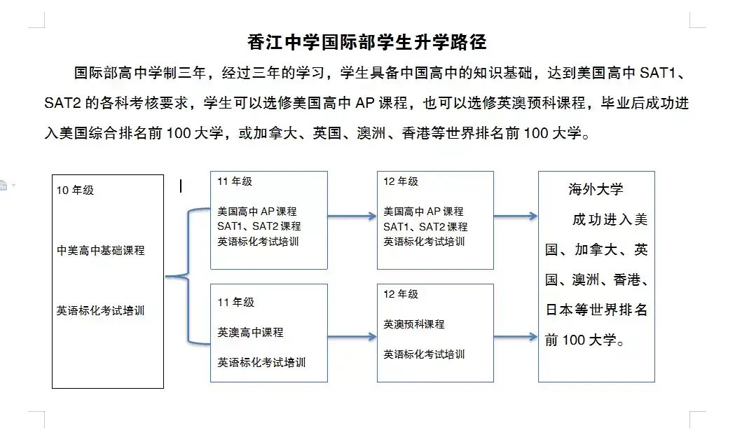 香江中学国际部虽然是国际高中,但她希望学生能够“传承中国文化,放眼世界未来”。在课程设置上,由于中美两国的高中课程知识点略有差别,国际部为学生作长远未来的考虑,将课程内容结合中国高中课程与美国高中课程的知识点进行授课,保证学生在毕业时除了具备参加美国高考的知识水平以外,也具备中国高考必备的相关知识。