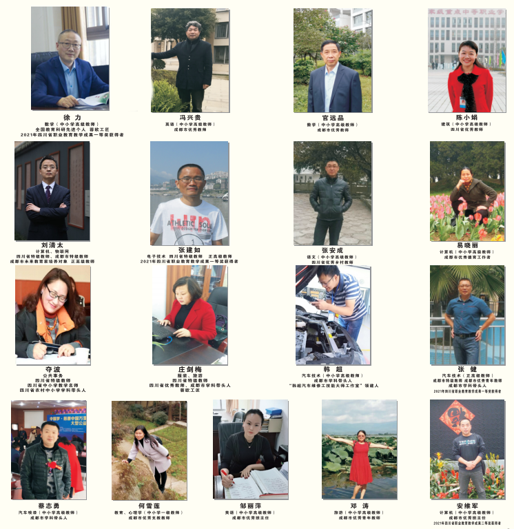 学校现有在编教师229人,在校学生4000余人。其中硕士研究生学历教师43人,具备中高级职称教师170人,四川省特级教师4人,中小学正高级教师3人,四川省优秀教师2人,四川省优秀校长、四川省优秀乡村教师、成都市优秀校长、成都市未来教育家培养对象、成都市教坛新秀各1人,成都市特级教师、成都市优秀支教教师各3人,成都市优秀德育工作者2人,成都市学科带头人、成都市优秀青年教师、成都市优秀班主任、蓉欧工匠各4人,区级骨干教师106人,“双师型”教师128人,特聘行业专家和技术能手46名,锻造出了一支“德高、技强、业精”的师资队伍。