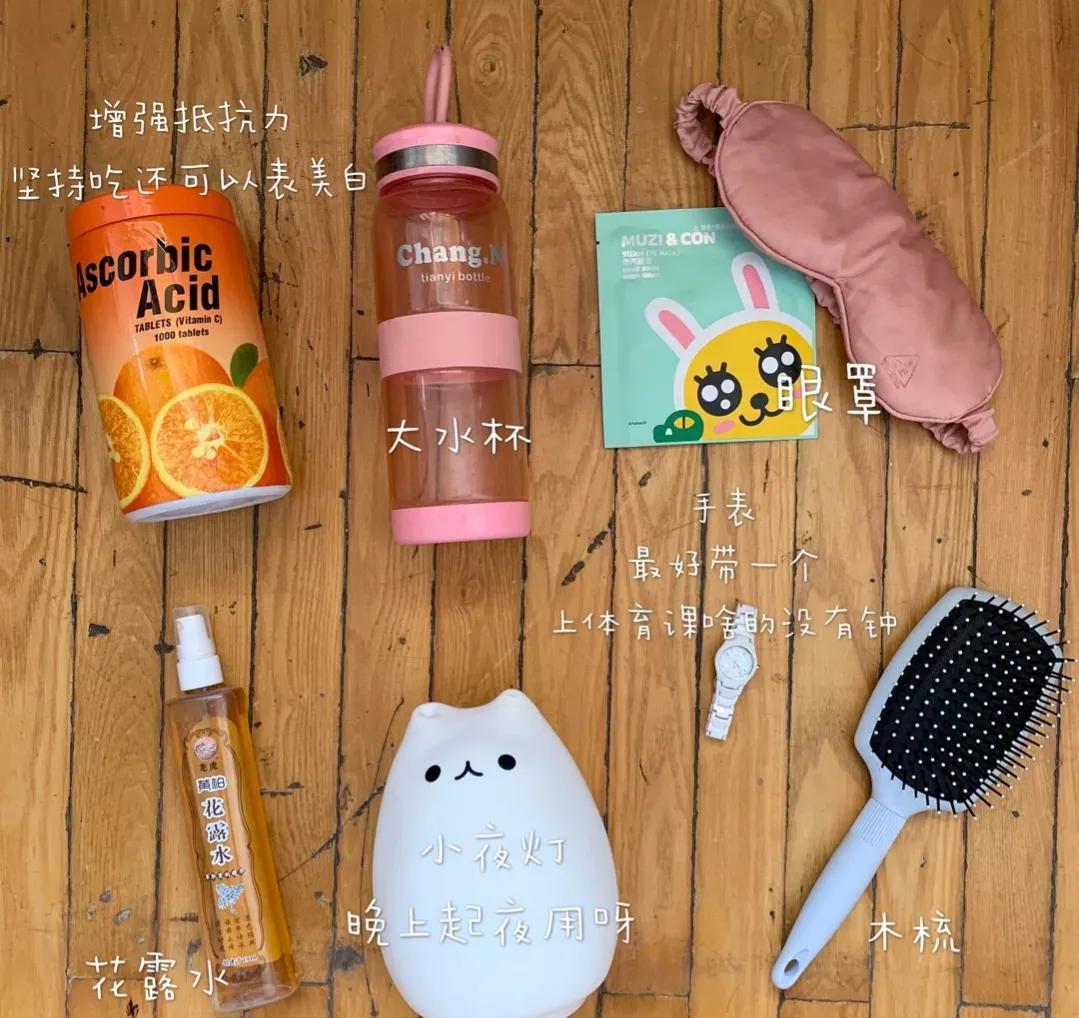 7.护肤品(防晒霜,芦荟胶,护手霜…根据自身带,一般初中高中管理都比较严格,不让化妆的,而且没超过18岁最好不要化妆.涂点防晒就好啦!)