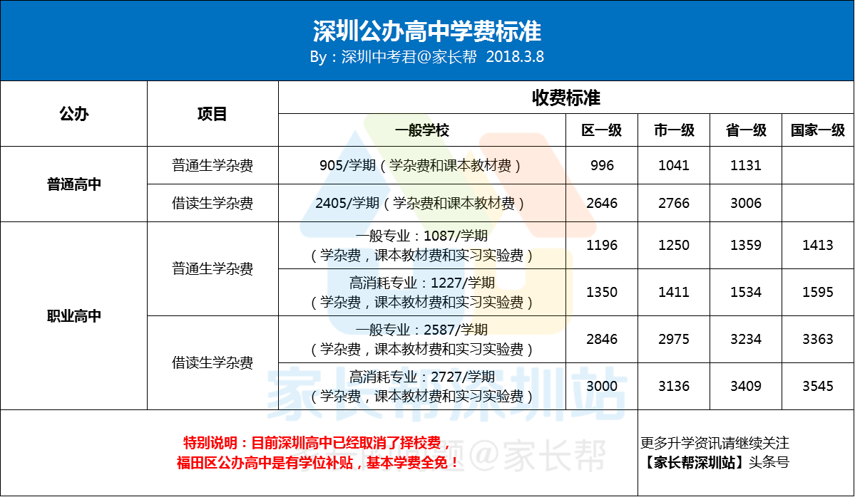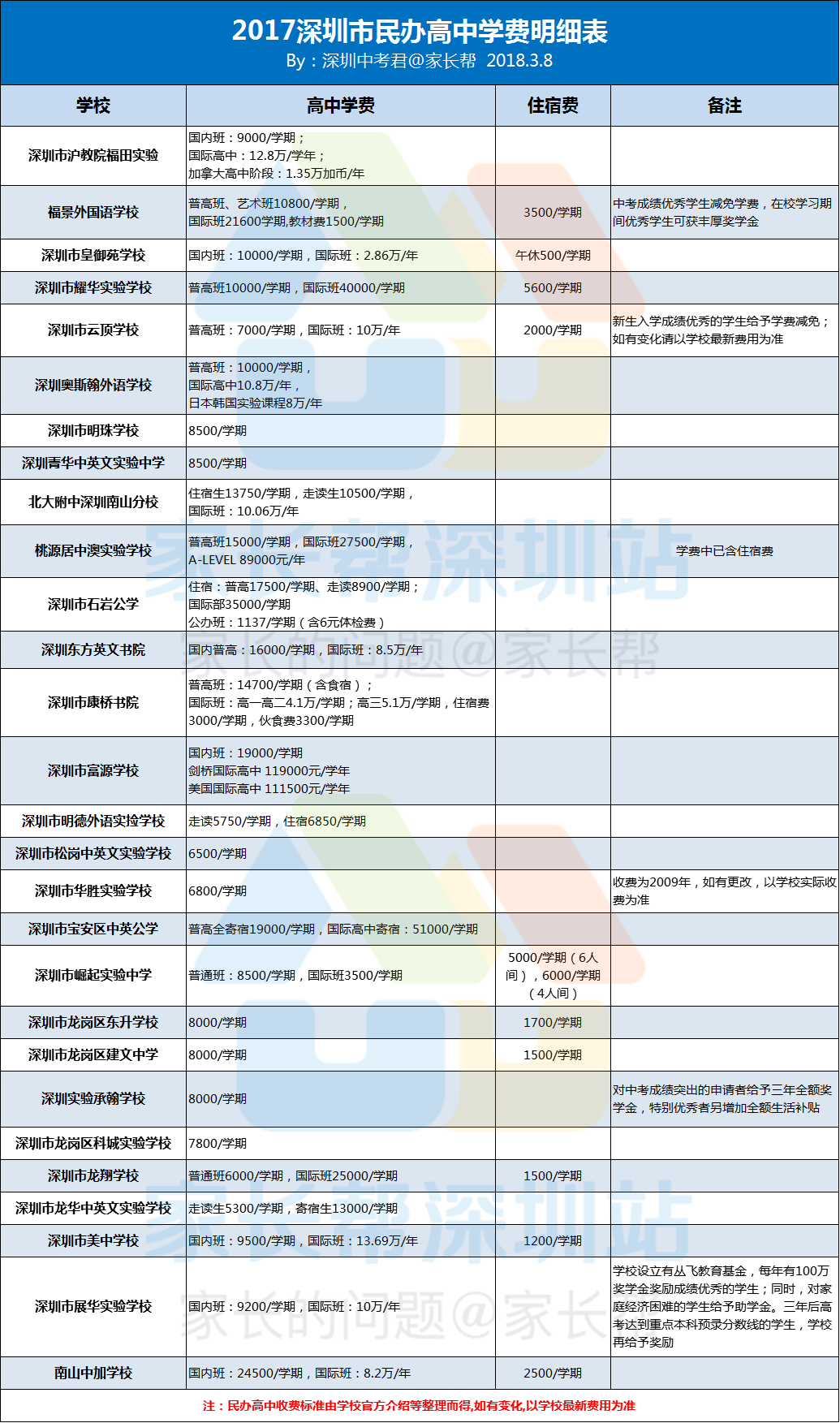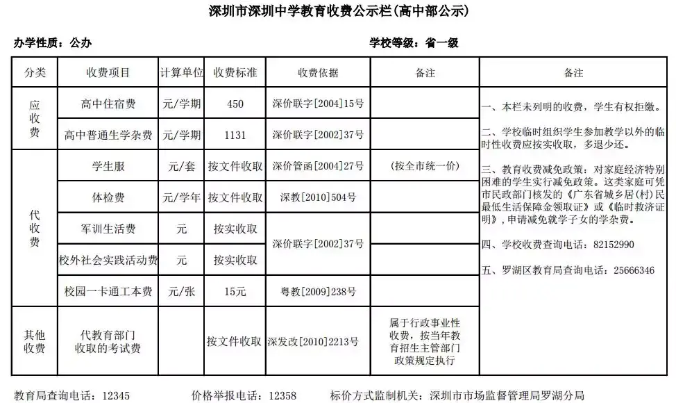 下面跟随小君来看下深圳各大高中的学费吧!目前深圳公办高中的学费都是统一标准,住宿费一般都是450元/学期!