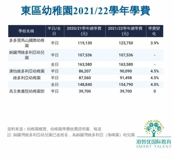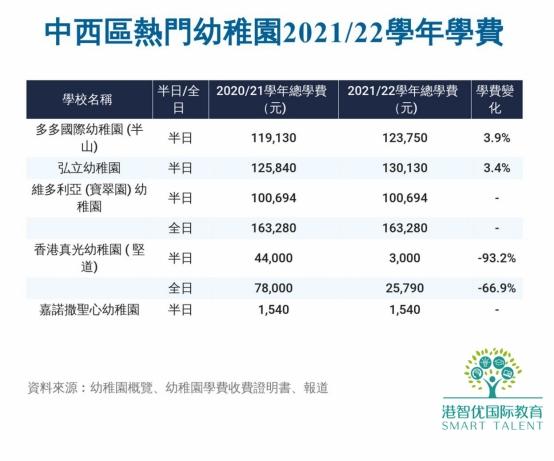 另有,有幼儿园学费加幅约一成,香港培正小学(幼儿园)去年半日班学费约4万,今年则增至4.3万元。有两间幼儿园加入计划,令学费大幅减低。香港真光幼儿园 (坚道)的半日班今年学费为3000元,比去年4.4万元大减93%;全日班则减约67%至2.5万元。天主教圣玛加利大幼儿园新学年则全免学费。香港智优国际教育向这3间学校查询,暂未有回覆。