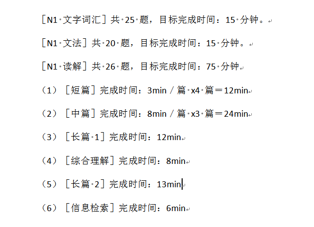 2、N1言语知识和读解的总共时间是110分钟,想要在考试中得心应手就得提前学会合理安排考试时间。