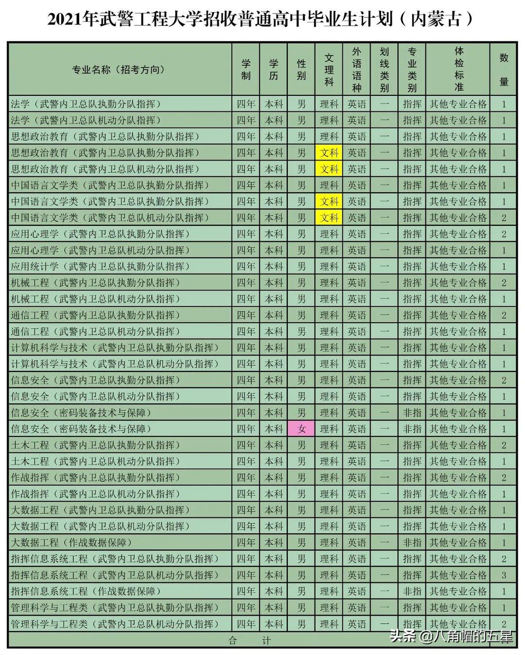 在全国各省份均有招生,且招生数量较多。毕业后分配在武警部队,多数驻地在市区,工作环境相较其它军种,相对宽松。