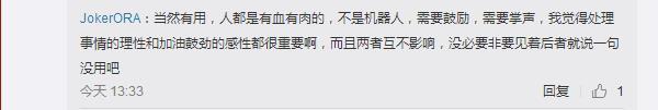 在逼捐的评论下面有人反驳,人都是有血有肉的,不是机器人理性和加油鼓劲的感性都很重要没必要见到加油鼓劲就说一句没用。