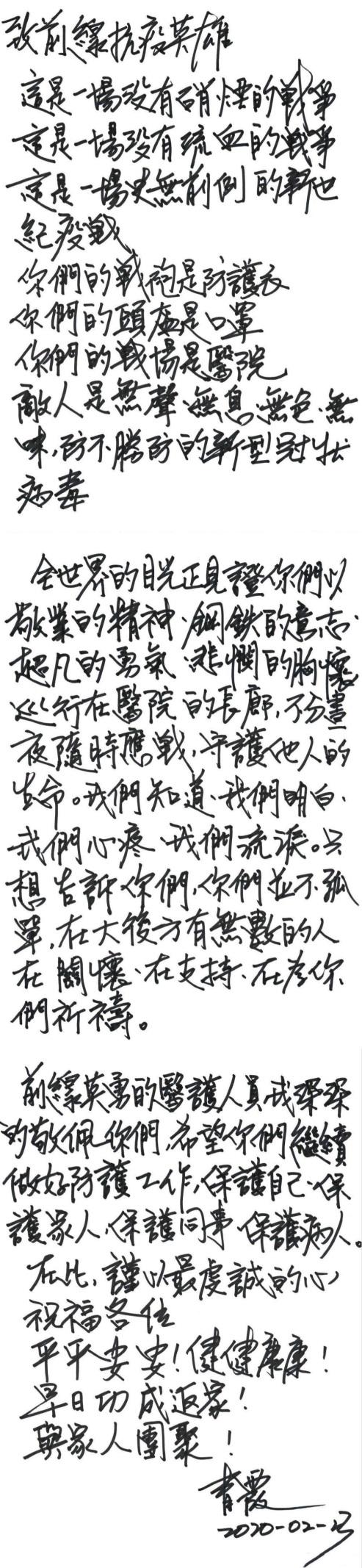真挚地表达自己对他们的敬佩和祝福"我深深敬佩你们,希望你们继续做好防护工作,保护自己、保护家人、保护同事、保护病人。在此,谨以最虔诚的心,祝福各位,平平安安!健健康康!早日功成返家!与家人团聚",最后亲切的落款:青霞。