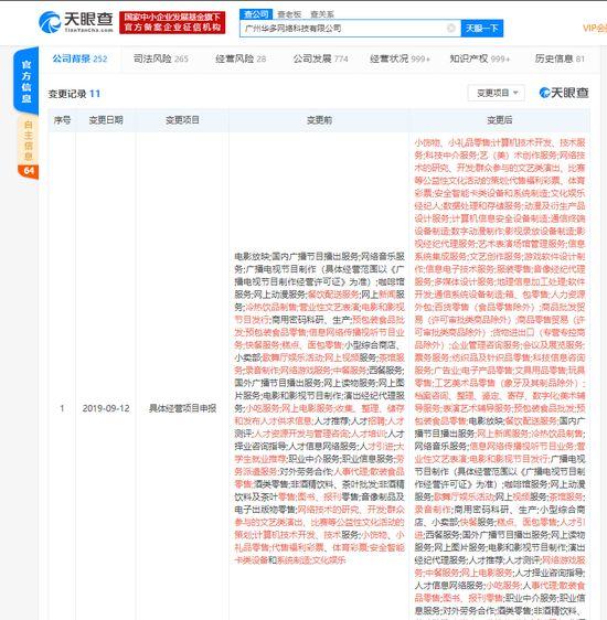 天眼查数据显示,9月12日,YY(欢聚时代)直播运营主体广州华多网络科技有限公司发生经营范围变更,新增“小饰物、小礼品零售;服装零售、箱、包零售、百货零售(食品零售除外)、电子产品零售”等,此次变更的经营范围超40个。