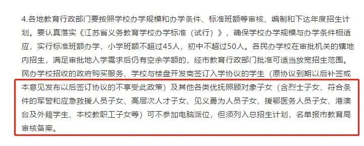 民办学校招收的政府购买服务、学校与楼盘开发商签订入学协议的学生(原协议到期以后补签或本意见发布以后签订协议的不享受此政策)及其他各类优抚照顾对象子女(含烈士子女、符合条件的军警和应急救援人员子女、高层次人才子女、见义勇为人员子女、援鄂医务人员子女、港澳台及外籍学生、本校教职工子女等)可不参加电脑派位。