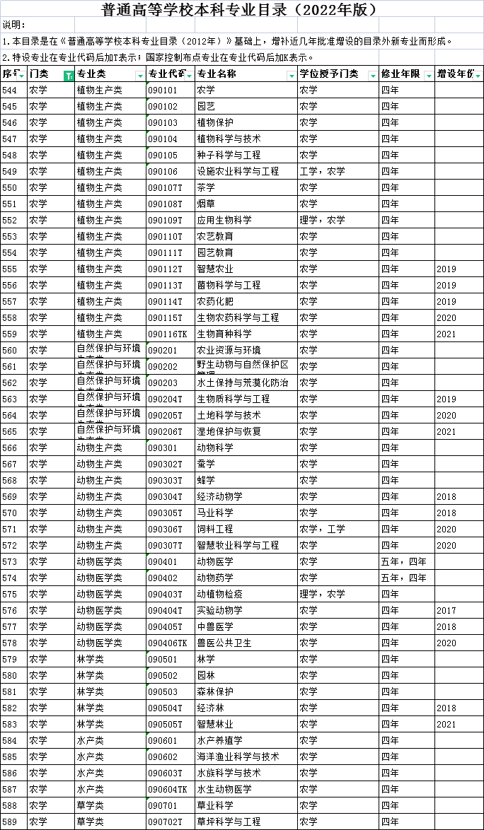 为什么要大家参考这个解释,那是因为这个解释与我们国家农学门类专业设置比较贴切。作为一个学科门类,农学在本科阶段一共有7个专业类46个专业,专业数量与理学相等。其中的7个专业类,与农业生产发展紧密相关,分别是植物生产类、自然保护和环境生态类、动物生产类、动物医学类、林学类、水产类、草学类。至于46个专业的详细名单,大家可以参考上面的表格。