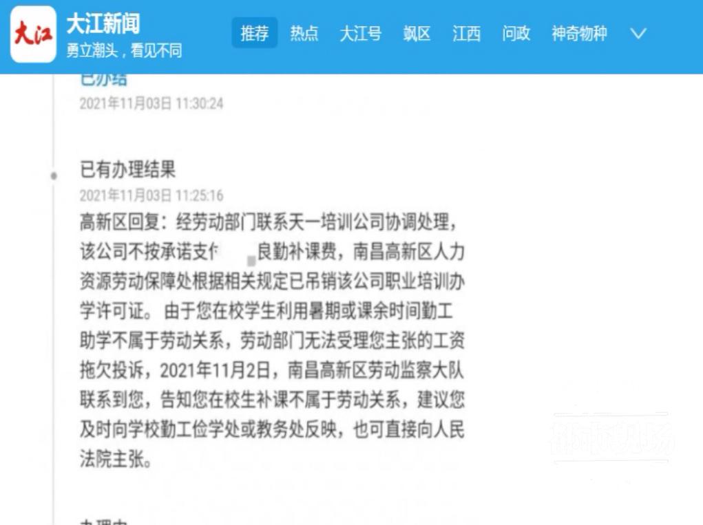 有学员表示,在网络问政平台查询到,2021年年底,这家机构的一名工作人员反映被拖欠了薪资,南昌高新区劳动保障监察大队的回复中提到,已经吊销了天一培训公司的职业培训办学许可证。
