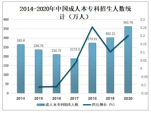 1.数据显示,2020年全国共招收成人本专科363.76万人,增长20.37%;而2019年成人本专科招生为302.21万人,增长10.57%。