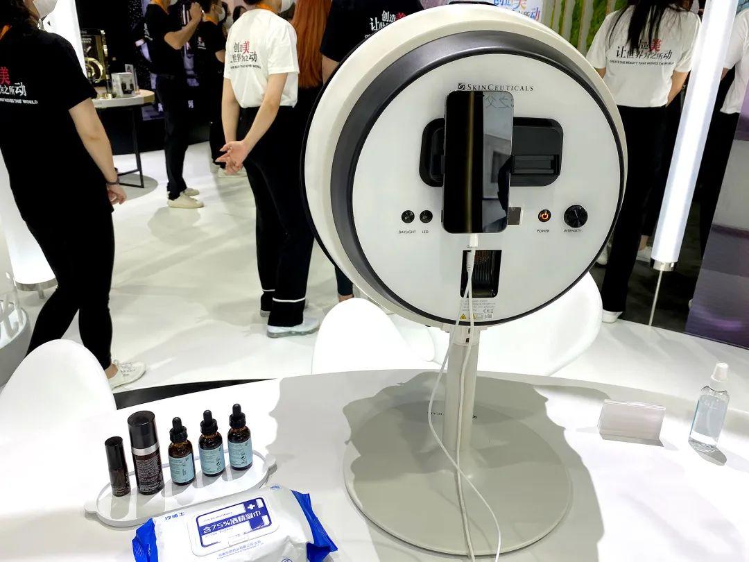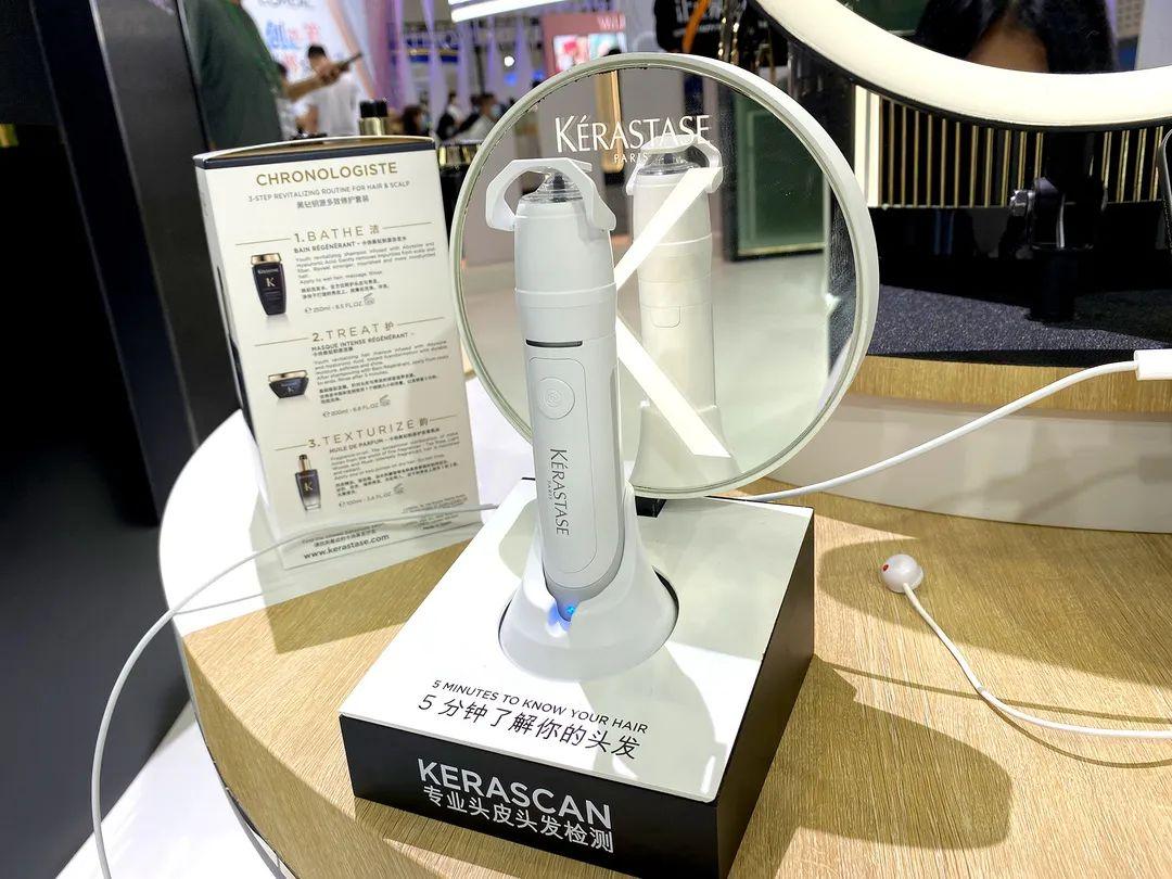 美妆+科技随处可见,计划于2022年登陆集团旅游零售市场的兰蔻专业肌肤检测仪全新升级,于消博会首秀,同时也是亚太地区旅游零售渠道首秀。科颜氏、卡诗、修丽可也都展出各品牌专业皮肤、头发检测仪器。