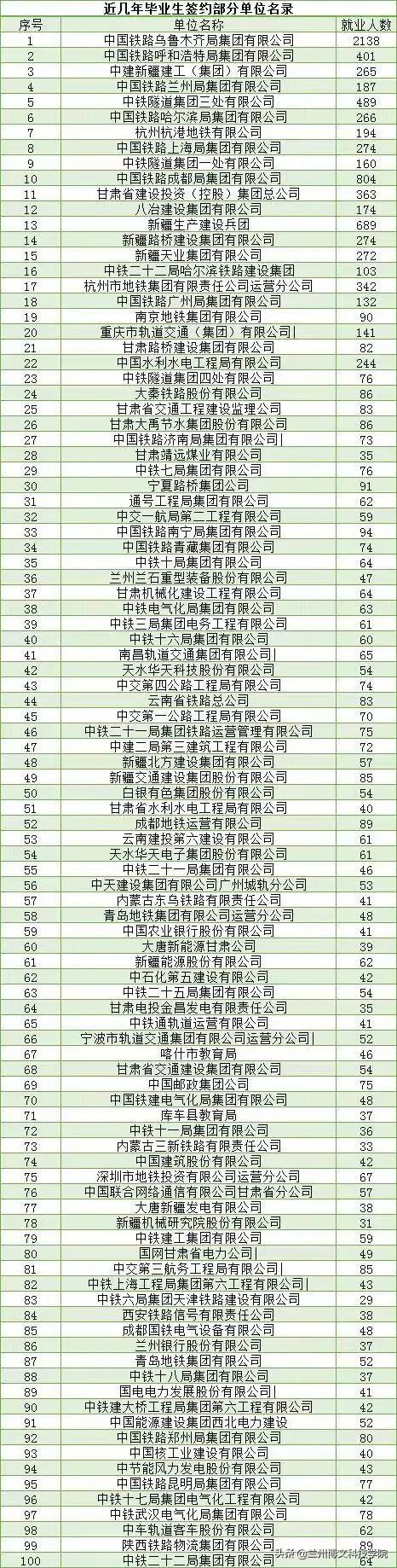 据悉,兰州博文科技学院的毕业生主要面向各大铁路局(公司)、中国中铁、中国铁建、城市轨道交通等大型国有企业就业。2019年,杭州地铁公司授予兰州博文科技学院“最佳人才培养奖”。在现阶段“交通强国,铁路先行”的大背景下,学校的发展迎来了前所未有的机遇,毕业生就业前景将会更加广阔。