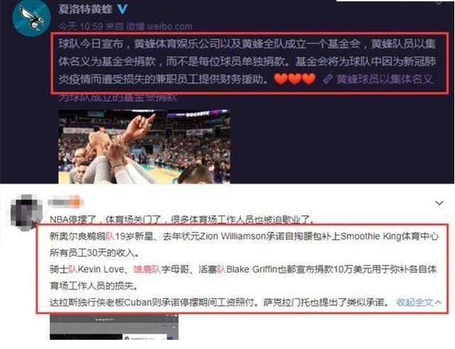 首先球队方面,乔丹与黄蜂队球员一起为承担停赛期间没有收入的临时工薪资问题,勇士队捐100万,现在有16支球队加入这项活动中。个人方面,独行侠老板库班从自己的金库中拿出钱来给临时工补助,乐福给骑士队的兼职人员和球员工作人员捐款10万美元,雄鹿队的字母哥和底特律活塞队的格里芬也捐款了10万美元给临时工做补贴。还有状元秀锡安,这位19岁的大男孩一个人承担了鹈鹕体育馆员工的一个月工资,毕竟他的代言收入可是达到1.5亿美元的。而感染了新冠肺炎的爵士戈贝尔,也向爵士主场的员工捐了20万美元。