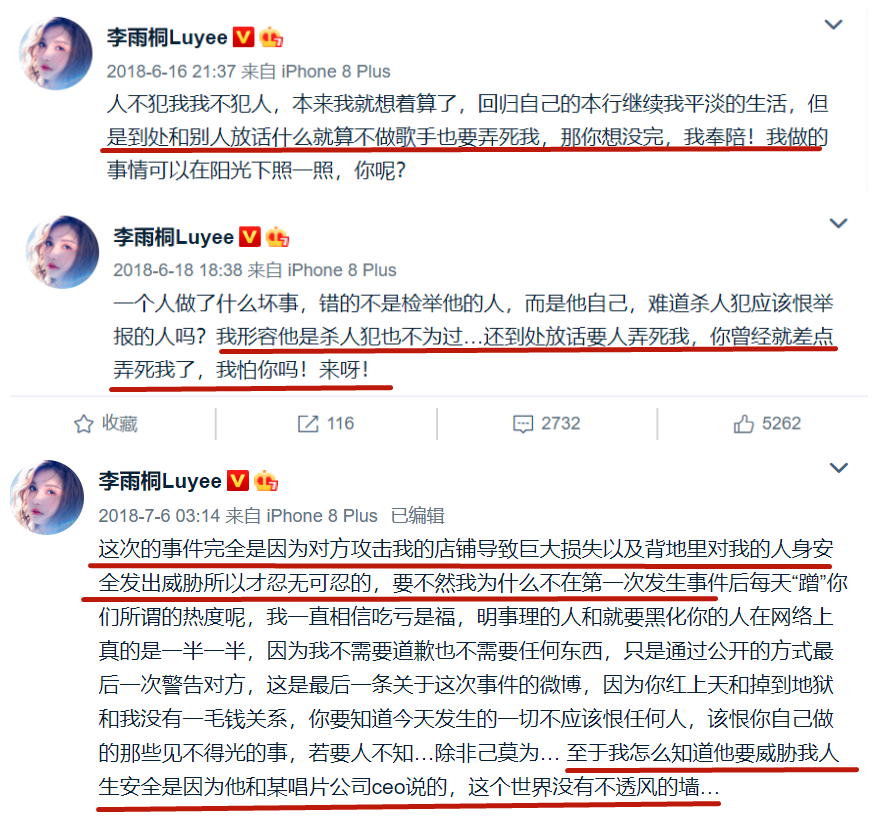 随着李雨桐的持续爆料,舆论的声讨越来越热烈,李雨桐还发出某人到处放话要弄死她的博文。