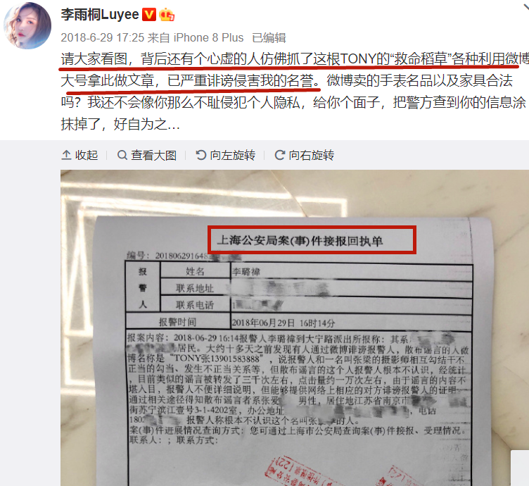 在这期间,因为摄影师张梁的站队,随后谣言四起,李雨桐也是直接报案,还是硬刚。(上图)