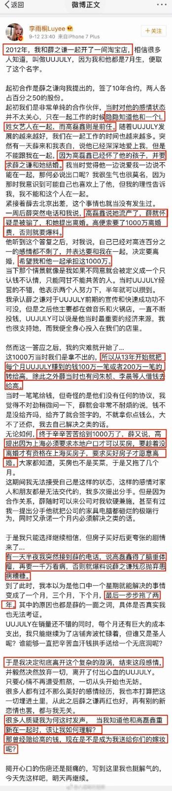 就如她长文的最后一段:很多人不明白为何这时发声,当我知道他与高磊鑫重新在一起时,该让我如何理解?那曾经赔给高的钱,现在是不是我送给你们的嫁妆呢?