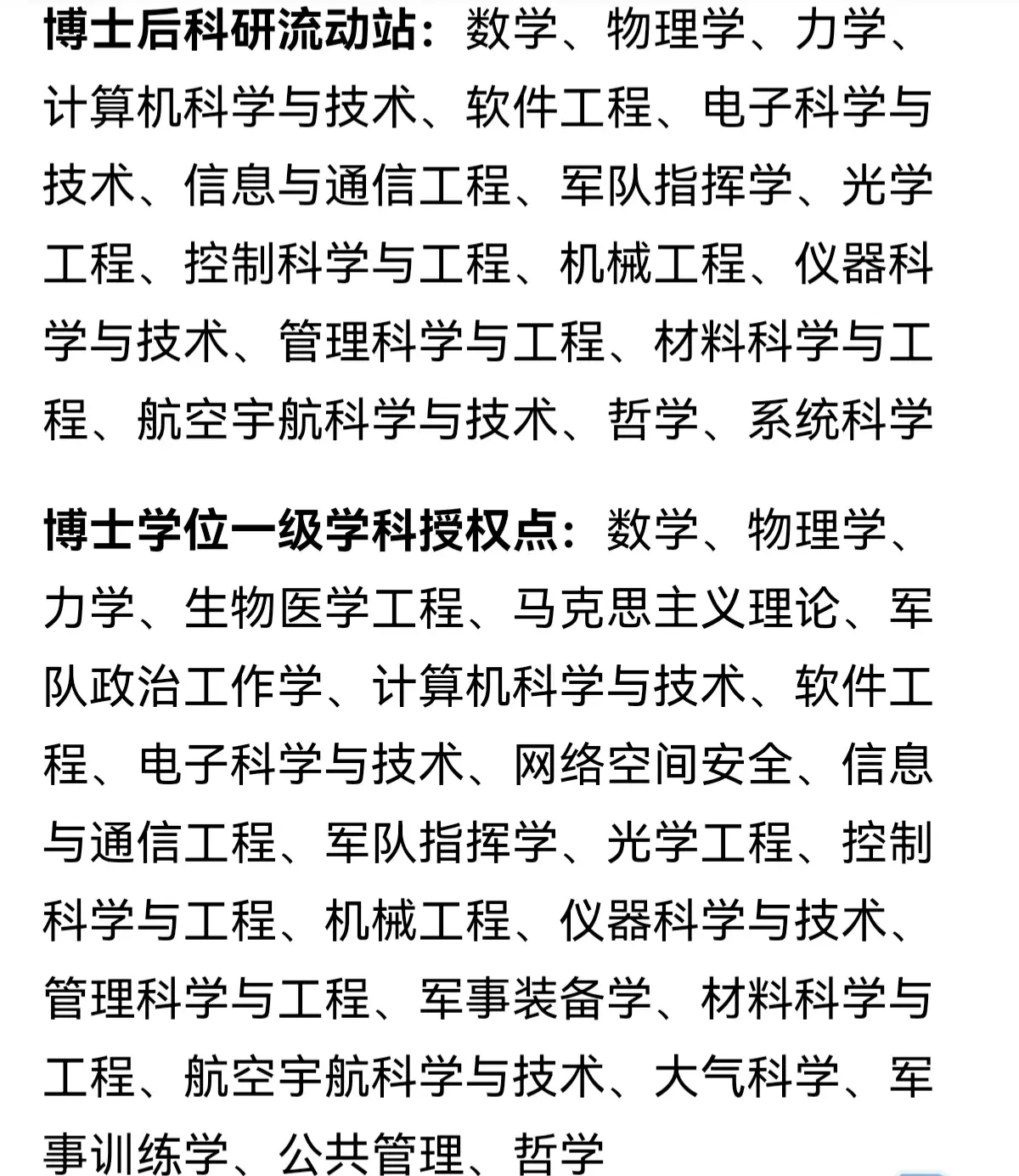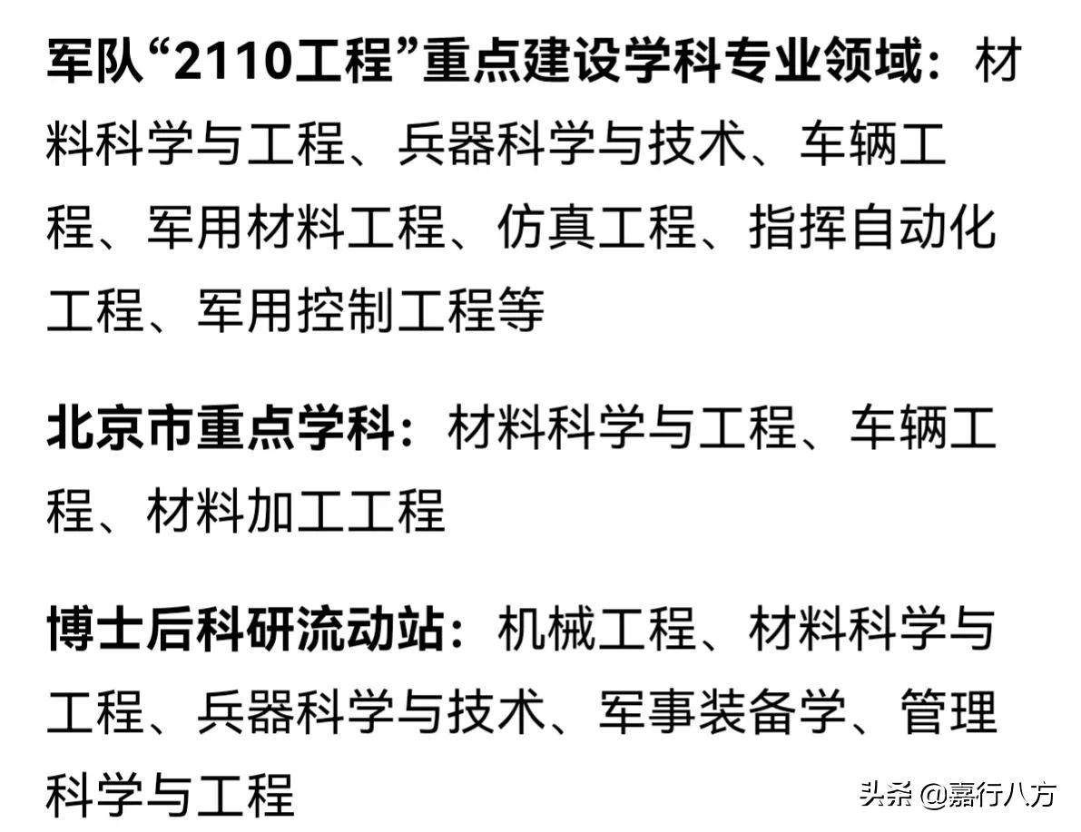 有2个军事领域和4个工程类别硕士专业学位授予权。有4个军队“十三五”重点建设学科专业领域、2个军队重点学科、3个北京市重点学科。