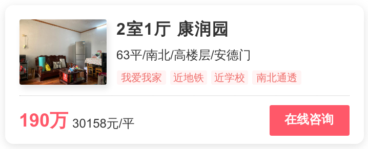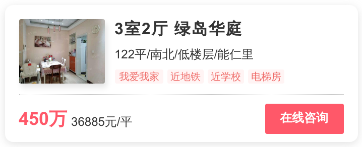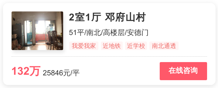 幸福里为你在雨花台找到了位于爱涛逸珍公馆、康润园、绿岛华庭、君悦城市花园、邓府山村的5套非常抢手的省重点附近房源。以下将详细介绍这套位于邓府山村,总价为132万的2居室。从小区层面上看,邓府山村位于安德门。截止2020年3月,小区的均价为27458元/平方米,分别低于安德门商圈均价(34915元/㎡)7457元,高于雨花台均价(26103元/㎡)1355元。从这套房源本身的卖点来看,省重点名校就在这套房附近;地铁站就在房子不远处,交通条件好。另外,这套2居室的房龄很短,这也意味着,你如果入手这套房,那么你既可以拥有与新房无异的居住舒适度,又可以享受到成熟小区的完善配套。难怪,这套房最近这么受南京购房者关注。此外,该房源为紧凑小二居,刚需最优选。电梯房,大大提高生活品质。点击以下房源卡片,即可查看房源照片及更多信息。