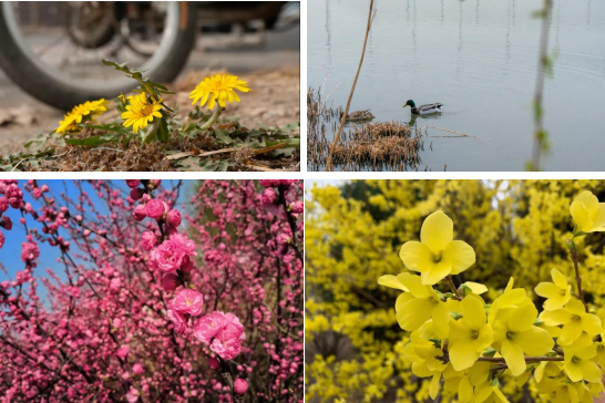 飞越了寒冬,经历了漫长的等待,迎来天商第一抹春:粉色桃花清丽婉约,屹立在三月的枝头;迎春花鲜艳明亮,蓬勃生长;鸭子成群结队地在双子湖上游动,用水波谱写一首春的赞歌。