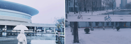 雪花带来了天商的冬季,校园里银装素裹,冷风吹过,抹上一层厚厚的凉意,湖面在冬日的冷冽下结上厚厚的冰,长椅留住晶莹剔透的雪花,学子们裹紧身上的棉服,奔走在上课的路上。雪晃晃悠悠地落了下来,校园沉浸在一片寂静中,明亮且澄净。