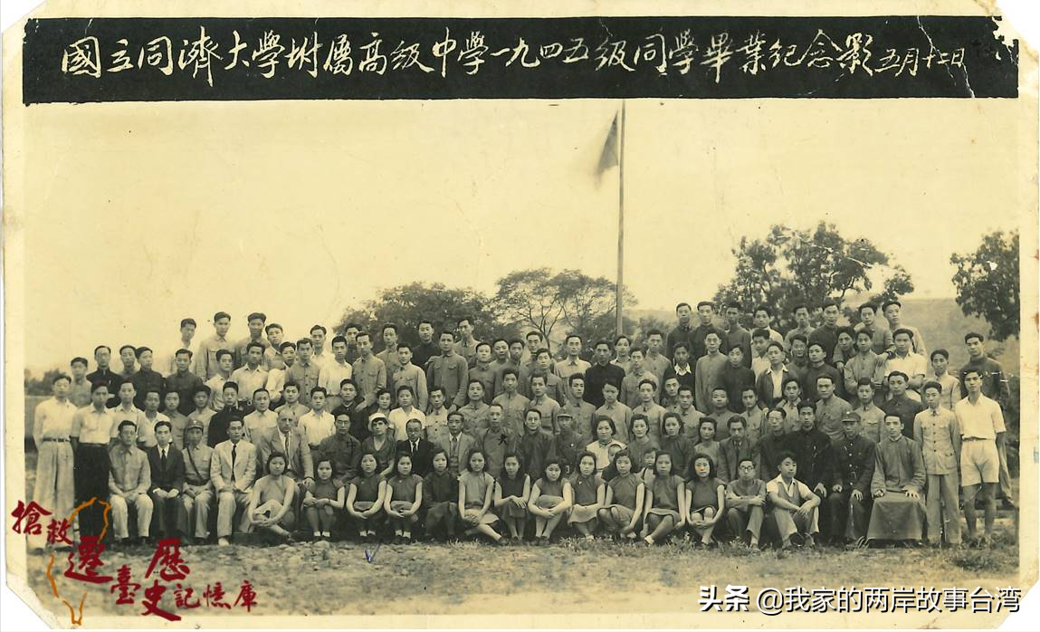 国立同济大学附属中学1945年级同学毕业纪念合影。陈嘉德为前排坐地上女生的左起第三位。