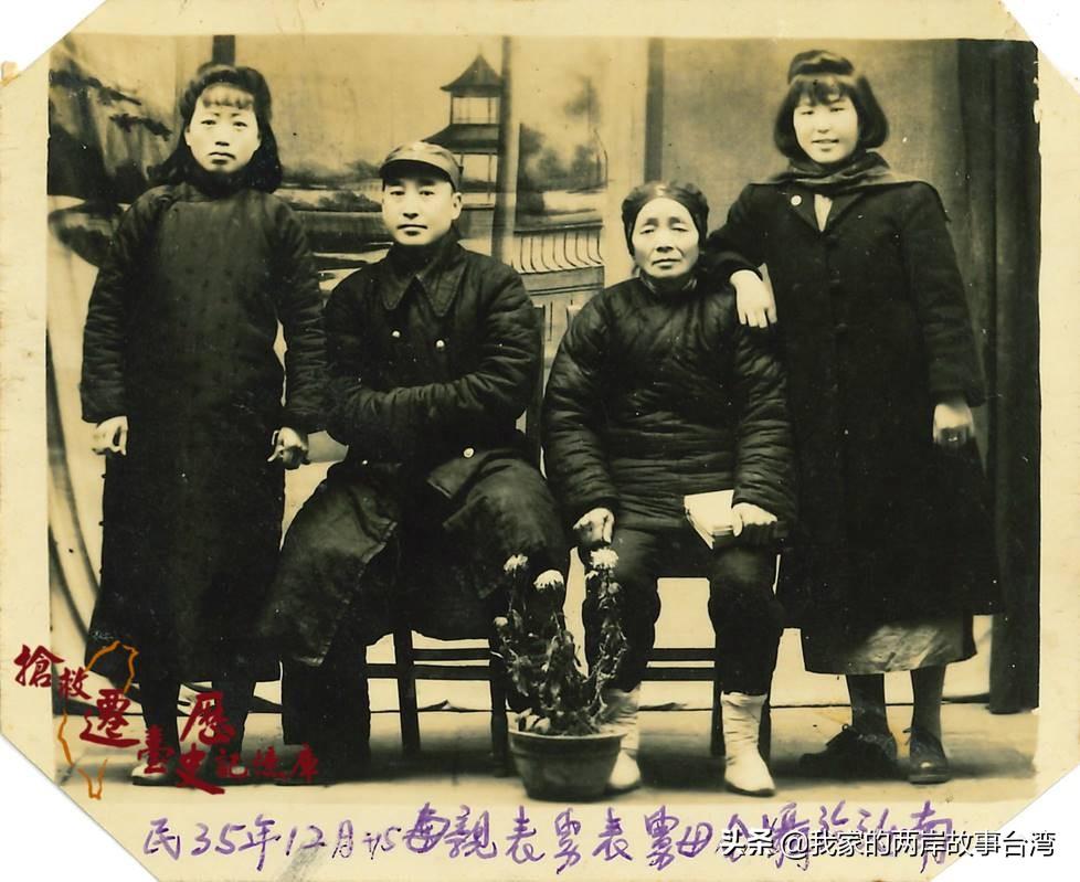 1946年12月陈嘉德(右一)在河南省汝南老家与母亲(右二)与表舅和表舅妈合影。