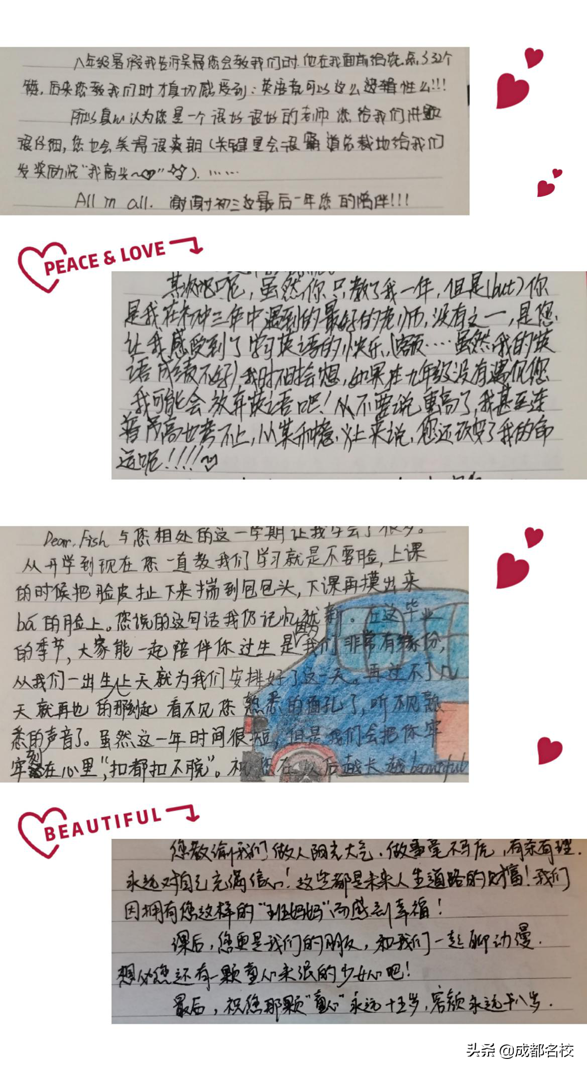 实习班上的孩子们送上一本同学录,里面是每个孩子想说却说不完的甜言蜜语;12届的孩子们送上一个小铁盒,里面是一张张写满了爱意的小卡片;15届的孩子们送出一封封炙热感人的手写信;16届的孩子们送上一本装订好的笔记本,在那笔记本中,有我崇尚的热血,有我喜欢的简单;18届的孩子们送上一个大大的许愿瓶,里面装着每个人为我写的小条子,用漂亮的细丝带捆好。