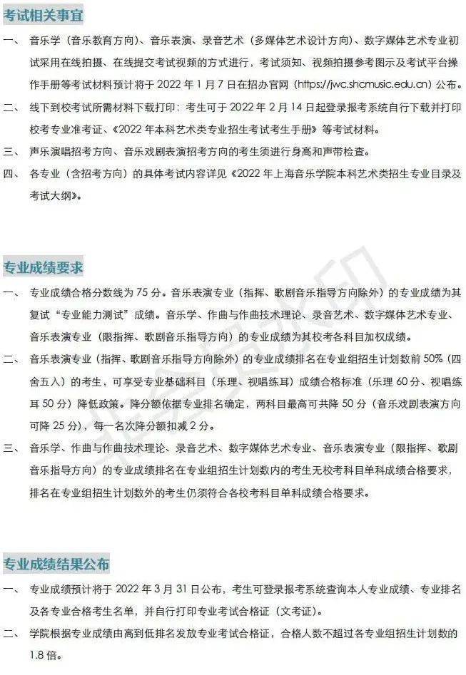 1.专业成绩合格的考生须参加2020年普通高等学校招生全国统一考试(高考)。上海音乐学院作为教育部批准的独立设置本科艺术院校,自主划定高考文化课最低录取分数线。