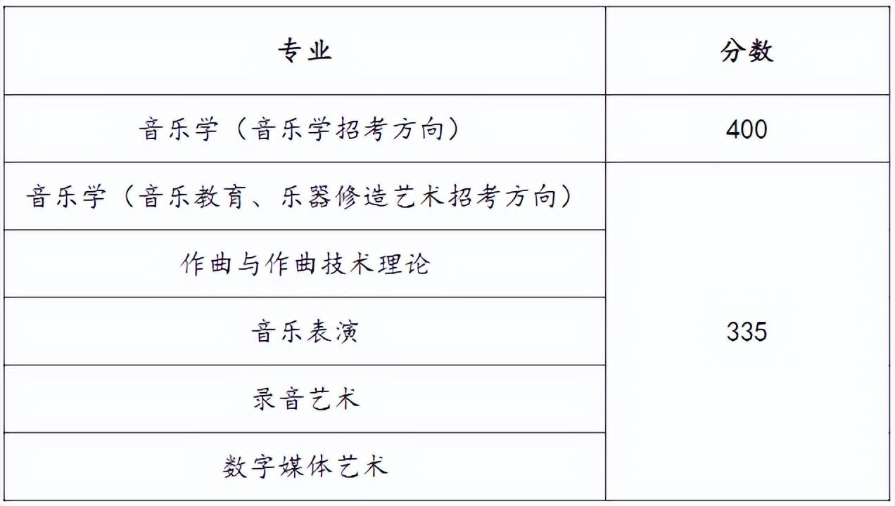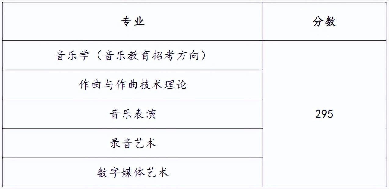 专业上海江苏新疆外省(除江苏,新疆)分文理科不分文理科音乐学(音乐学招考方向)373237395(文)387(理)395音乐学(音乐教育、乐器修造 艺术招考方向)249170283(文)277(理)283作曲与作曲技术理论音乐表演录音艺术数字媒体艺术