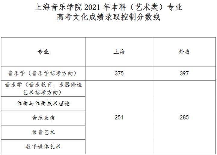 2021年上海音乐学院本科艺术类专业高考文化成绩录取控制分数线