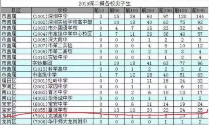 当时也是网上流传的一张“2019深二模各校尖子生”的图表,显示在衡水中学的加持下,一所名不见经传的深圳宝安区富源中学,垄断了尖子生前10名中的6个,在前50名占据了13个,直接团灭深圳传统四大高中。