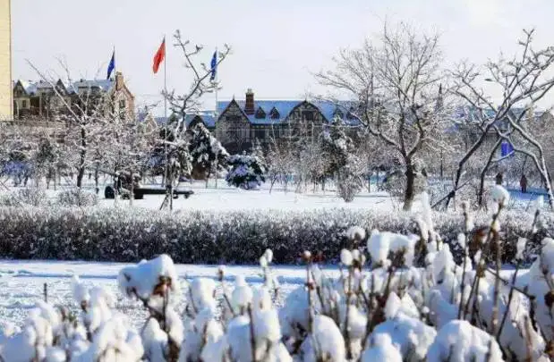 大雪之后的校园,变成了银装素裹的雪白世界,道路两旁嫩绿的树叶与红彤彤的花瓣上布满晶莹的霜花,在暖阳的照射下,发出耀眼的光芒。