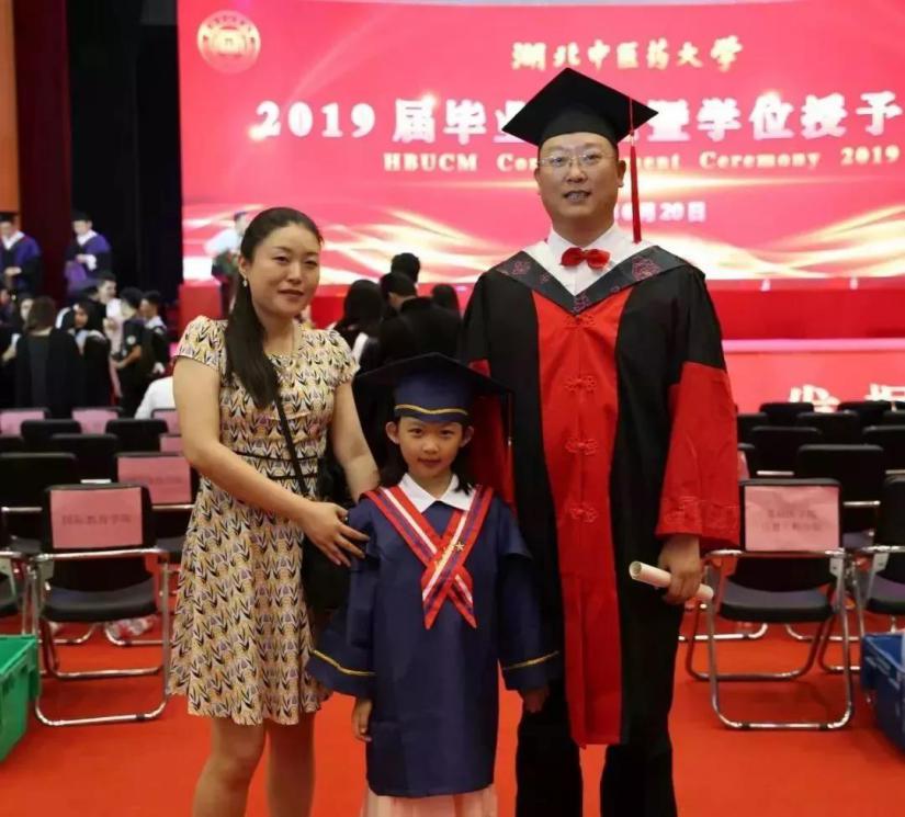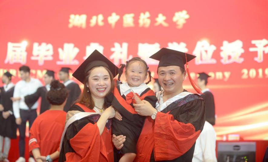 典礼现场还有一对博士夫妻带娃庆毕业,格外惹人注目。刘晶是基础医学院博士毕业生。2002年考入湖北中医药大学时,老公陈伟栋是学长。2011年二人结婚,2017年有了宝宝。2018年,陈伟栋从中医临床学院博士毕业到了武汉市第一医院工作。"今天带着2岁的女儿回母校,还专门借了师弟的博士服拍了同框照,觉得特别有意义。"陈伟栋说。